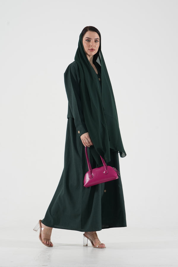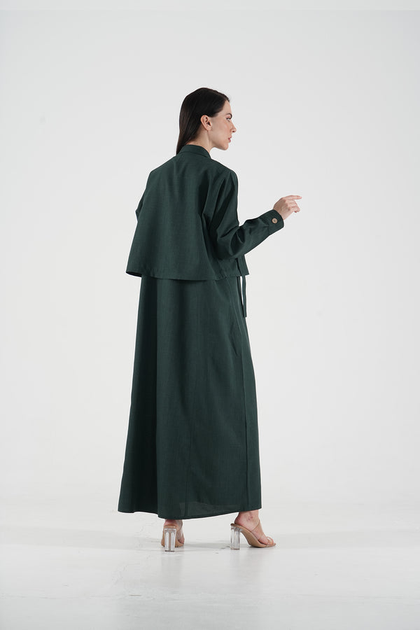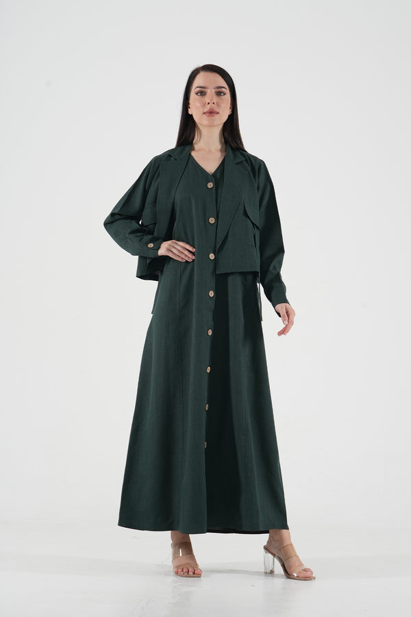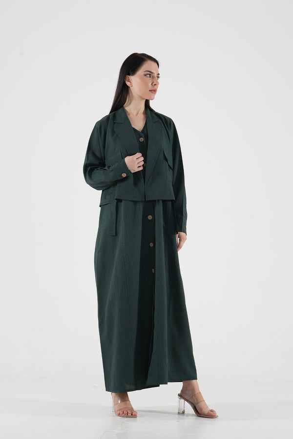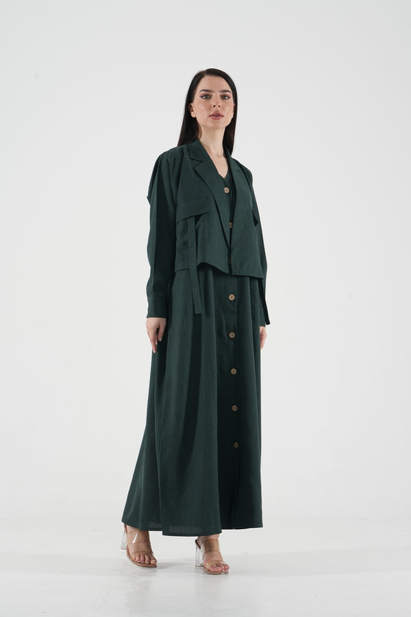The abaya depicted is a contemporary design characterized by a long , flowing silhouette. It features a deep green color and has a button down front ,giving it a modern yet stylish appearance. The outfit is complimented by a cropped jacket with oversized sleeves , adding a modern twist to the garment.