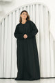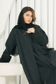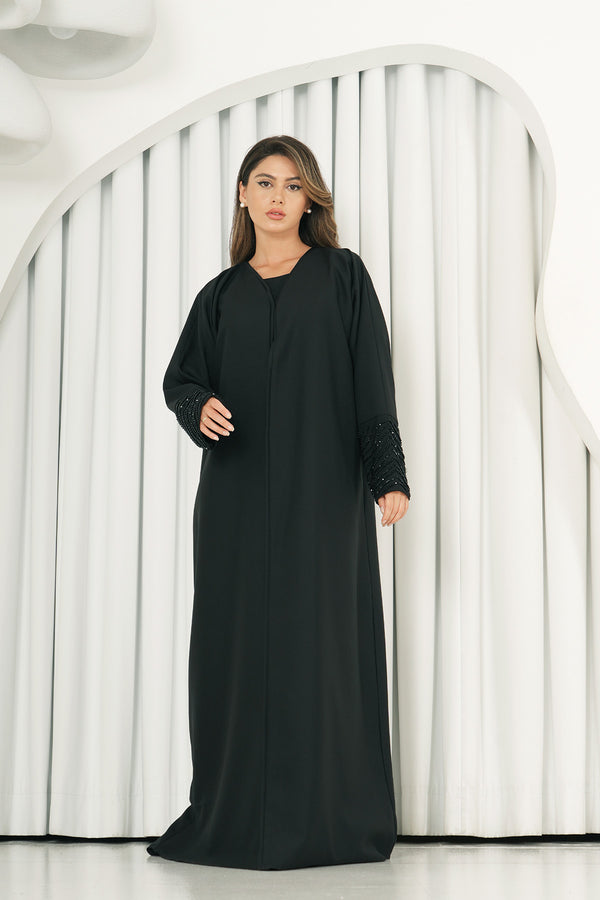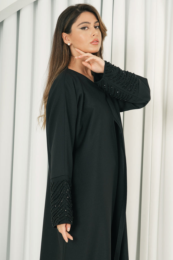 This exquisite black abaya features stone work on sleeve cuffs. The meticulously placed stones create a shimmering effect , adding a glamourous flair to the design . It is perfect for special occasions or everyday wear as it combines classic modesty with modern artistry. The set includes abaya with black chiffon headscarf.