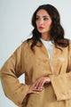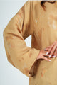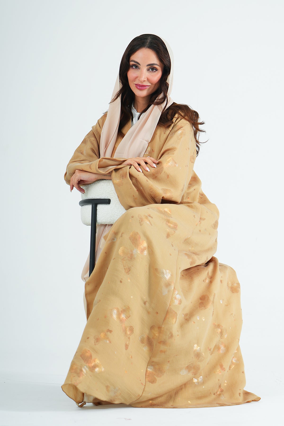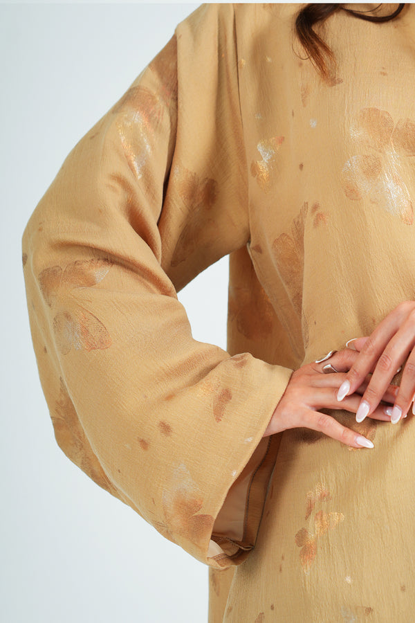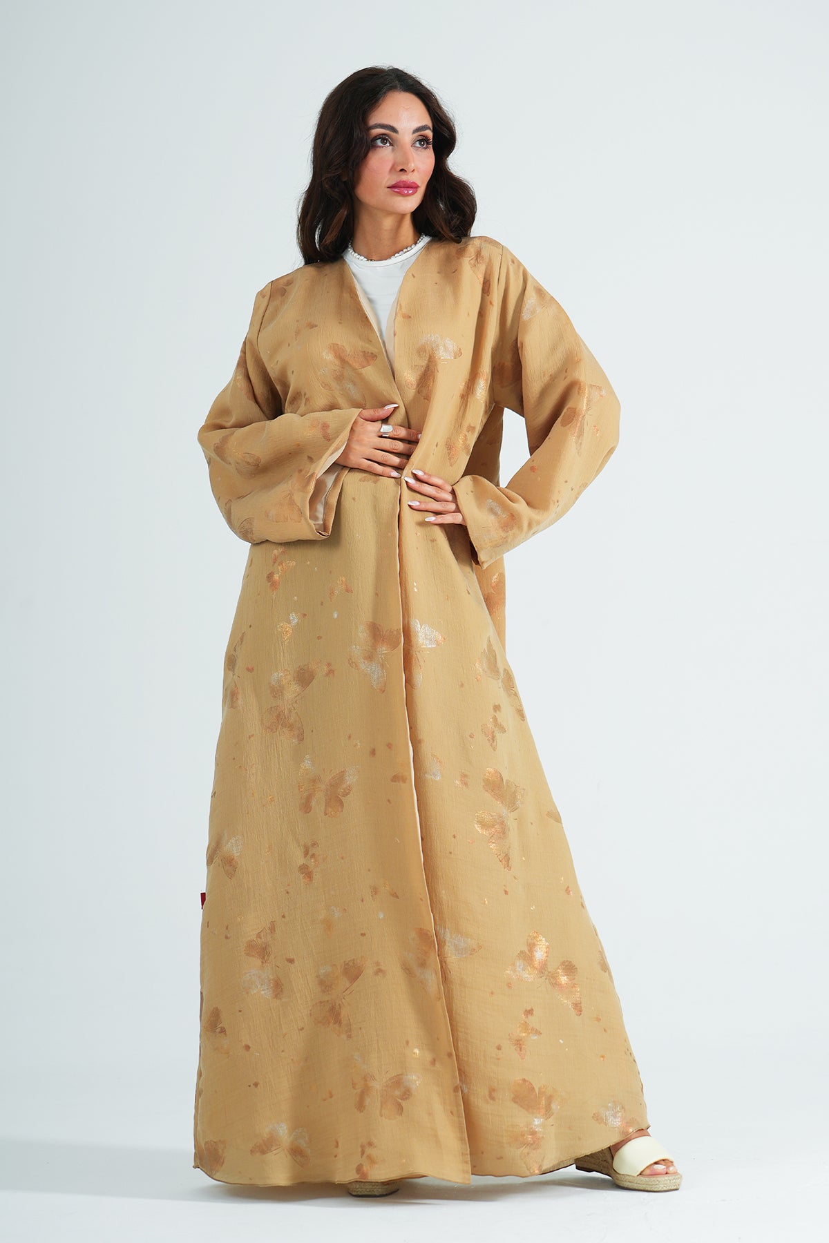 It features a warm beige colour with subtle , metallic butterfly patterns that add style and grace . The look is both modest and stylish , perfect for day to day wear or special occasions .